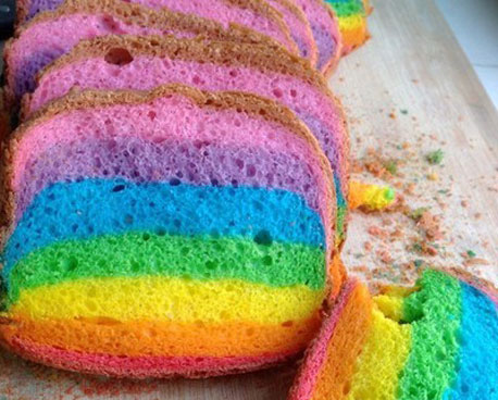 10. 重復步驟9,把綠色、藍色、紫色的長方形面團依次疊放在黃色面團上。