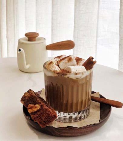 棉花糖搭配上濃郁的可可,表面的棉花糖被可可的熱度融化后,喝下去口感順滑~