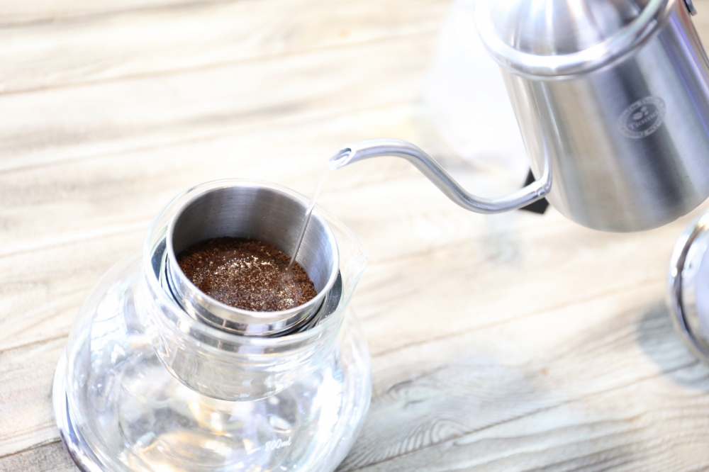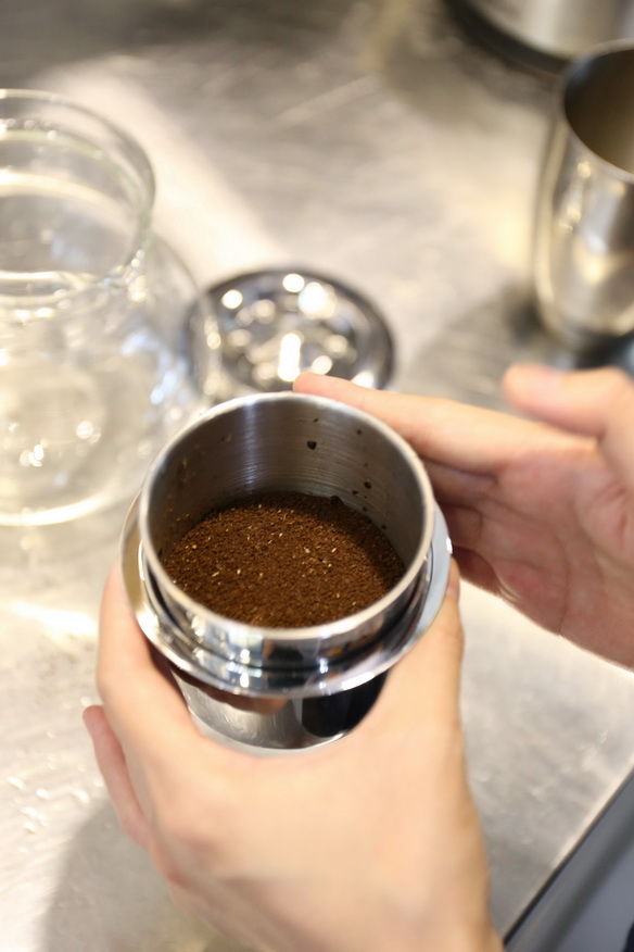 向過濾杯中倒入咖啡粉,輕拍使咖啡粉布粉均勻些。然后用冷水以打圈的形式注入咖啡粉,使咖啡粉濕潤。然后蓋上過濾杯蓋。