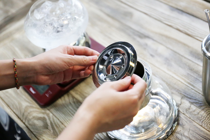 把冰滴壺組裝好。旋轉閥門桿可以調節冰水滴速。滴速過快可能造成萃取不足,缺乏風味。過慢會造成萃取過度,可能導致苦味和澀味的出現。這次我們用的滴速是1分鐘40滴,大概3秒2滴。