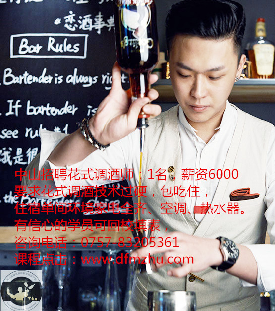 中山招聘花式調酒師:1名,薪資6000,要求花式調酒技術過硬,包吃住,住宿單間環境家電全齊、空調、熱水器。有信心的學員可回校填表,咨詢電話:0757-83205361. 課程點擊:www.ybtour.cn
